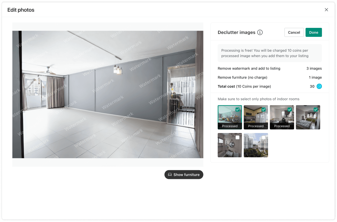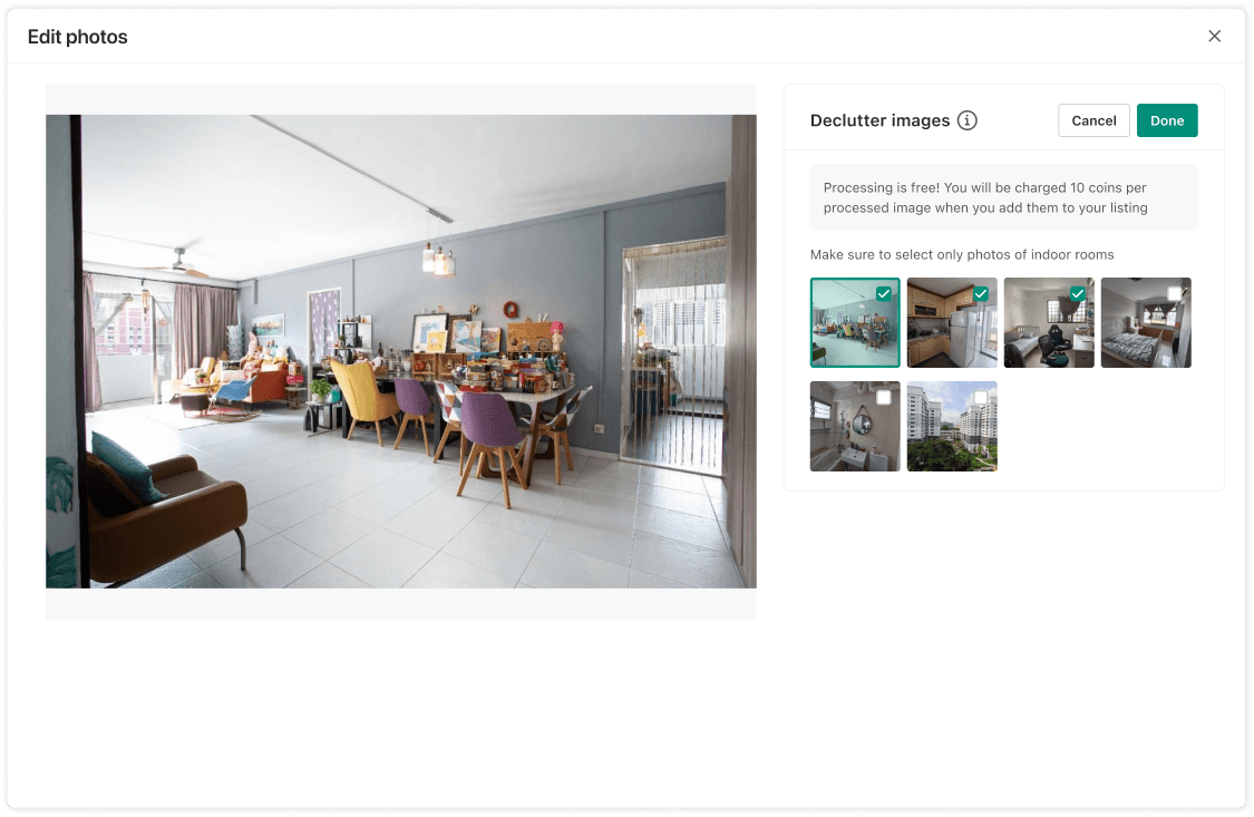 Upon curation of images, we immediately surface "Declutter your listing" as a seller tool with visual preview of before/after
